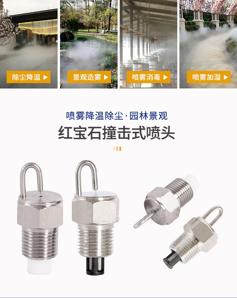 總結:紅寶石撞擊噴嘴,霧鳥噴霧系統技術專注于噴霧降塵、加濕、除臭、降溫等領域,專業于紅寶石噴嘴,紅寶石撞擊噴嘴,冷霧噴嘴領域,有全自動噴霧設備,生產廠家可定制貼牌,針對環境治理有豐富經驗。