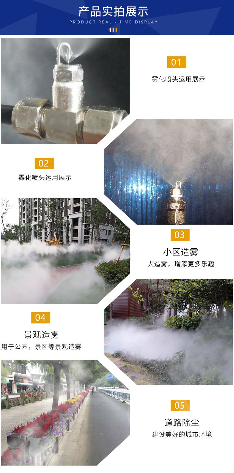 應用:1. 它具有造景、美化環境的功能,可廣泛應用于園林景觀效果,如公園、園林綠化區、假山瀑布、配合各式噴泉、景觀湖等。2. 它具有增濕、降溫、隔熱、除塵除味的效果,適用范圍包括:游樂場、體育館、高爾夫球場、溫室、廠房車間、大棚等。3. 它還具有防塵功能,可用于水泥廠、公路收費站的空氣除塵。