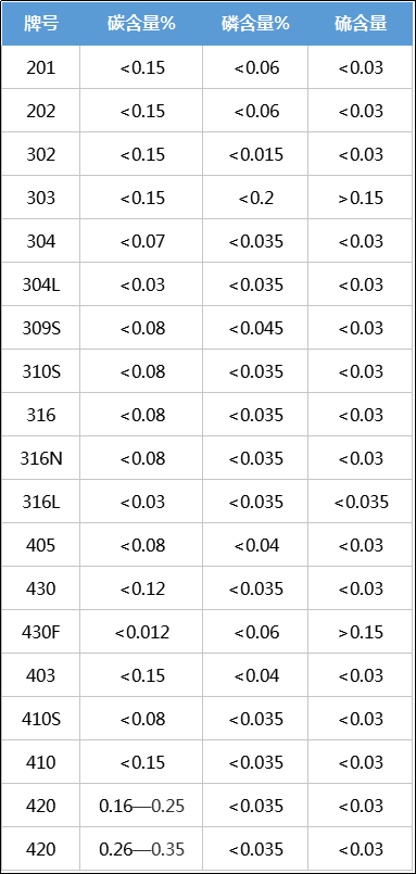 常用不銹鋼型號常用數(shù)字符號表示,有200系列,300系列,400系列,它們是美科的表示方法,如201,202,302,303,304,316,410,420,430等,中科的不銹鋼型號是用元素符號加數(shù)字表示,如1Cr18Ni9,0Cr18Ni9,00Cr18Ni9,1Cr17,3Cr13,1Cr17Mn6Ni5N 等,數(shù)字表示相應(yīng)的元素含量。